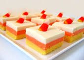- Again, reheat the remaining 1/3 of fudge over low heat until melted and smooth. Whisk in yellow food coloring and pour over orange layer in baking dish.